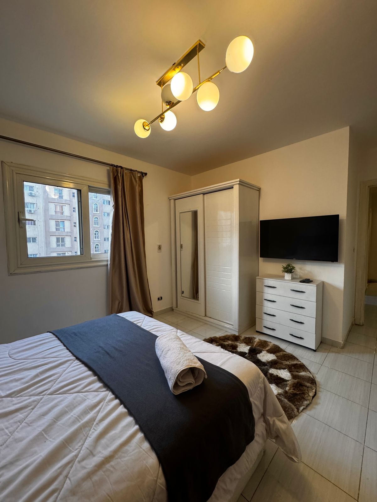 شقة في مدينتي بالمرحلة الثانية النموذج ( 100 ) المساحة 107 متر2 قبلي تطل على حديقة تشمل 2 نوم 1 حمام 1 بلكونة بالطابق الخامس تشطيب الشركة للإيجار مفروش 25,000 جنيه و