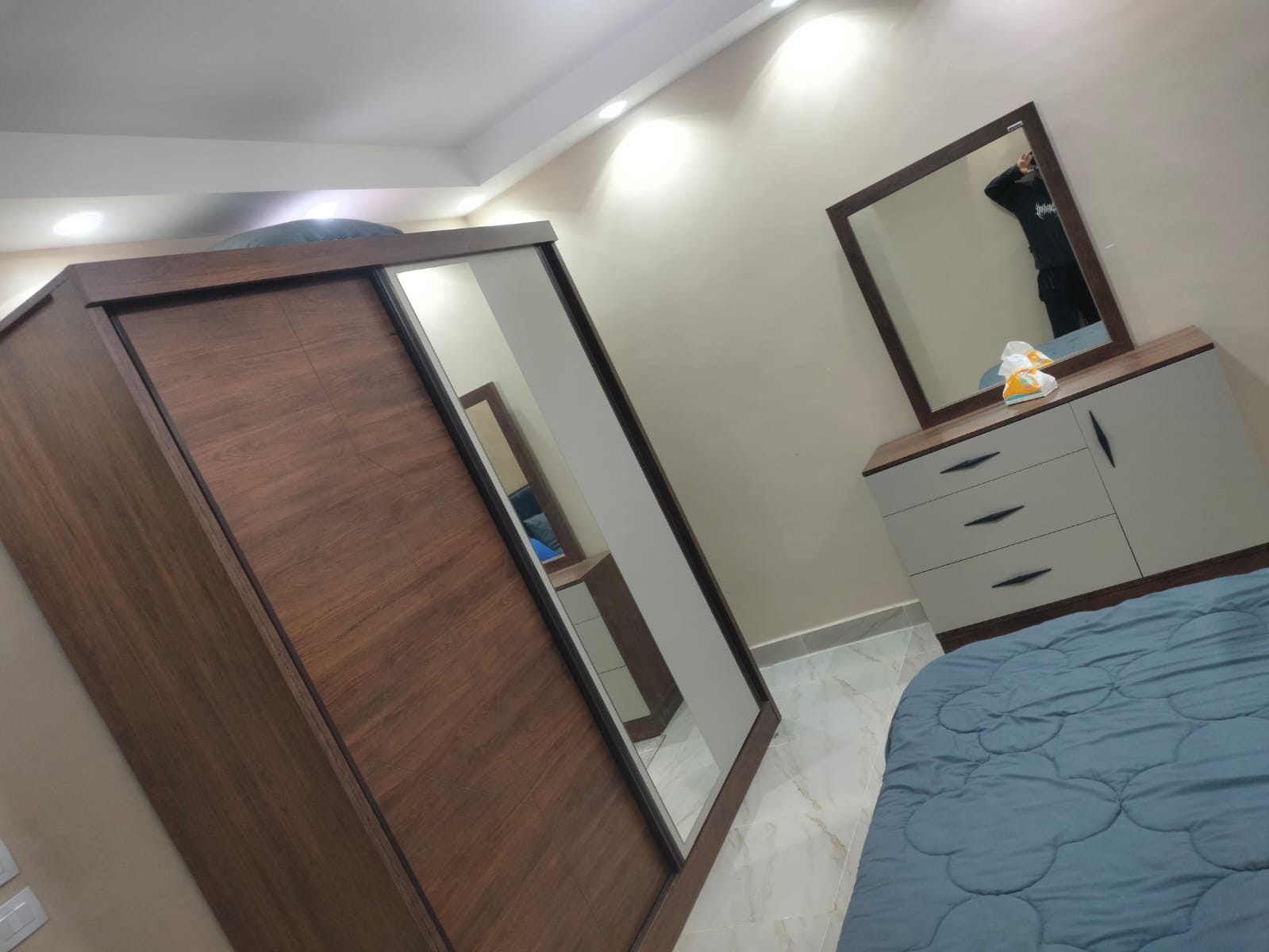 شقة في مدينتي بالمرحلة الثانية النموذج ( 100 ) المساحة 107 متر2 بحري و غربي تطل على باركنج تشمل 2 نوم 1 حمام 1 بلكونة بالطابق الثاني تشطيب الشركة للإيجار مفروش 25,000 جنيه و WiFi إنترنت فايبر \\n مكيفه air conditioner