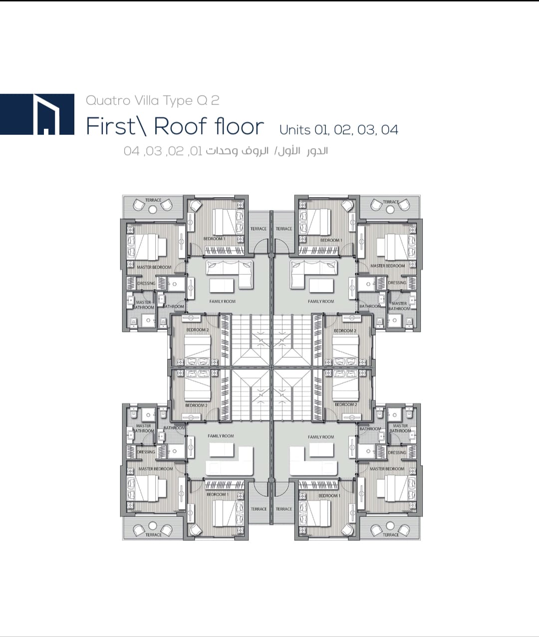فيلا رباعية في نور بالمرحلة الرابعة النموذج ( Q1 ) المساحة 211 متر2 مساحة المباني 195 متر2 تطل على تشمل 3 نوم 2 حمام 2 بلكونة بدون تشطيب بإشتراك النادي للبيع تقسيط على 13 سنة بمقدم 2,856,000 جنيه